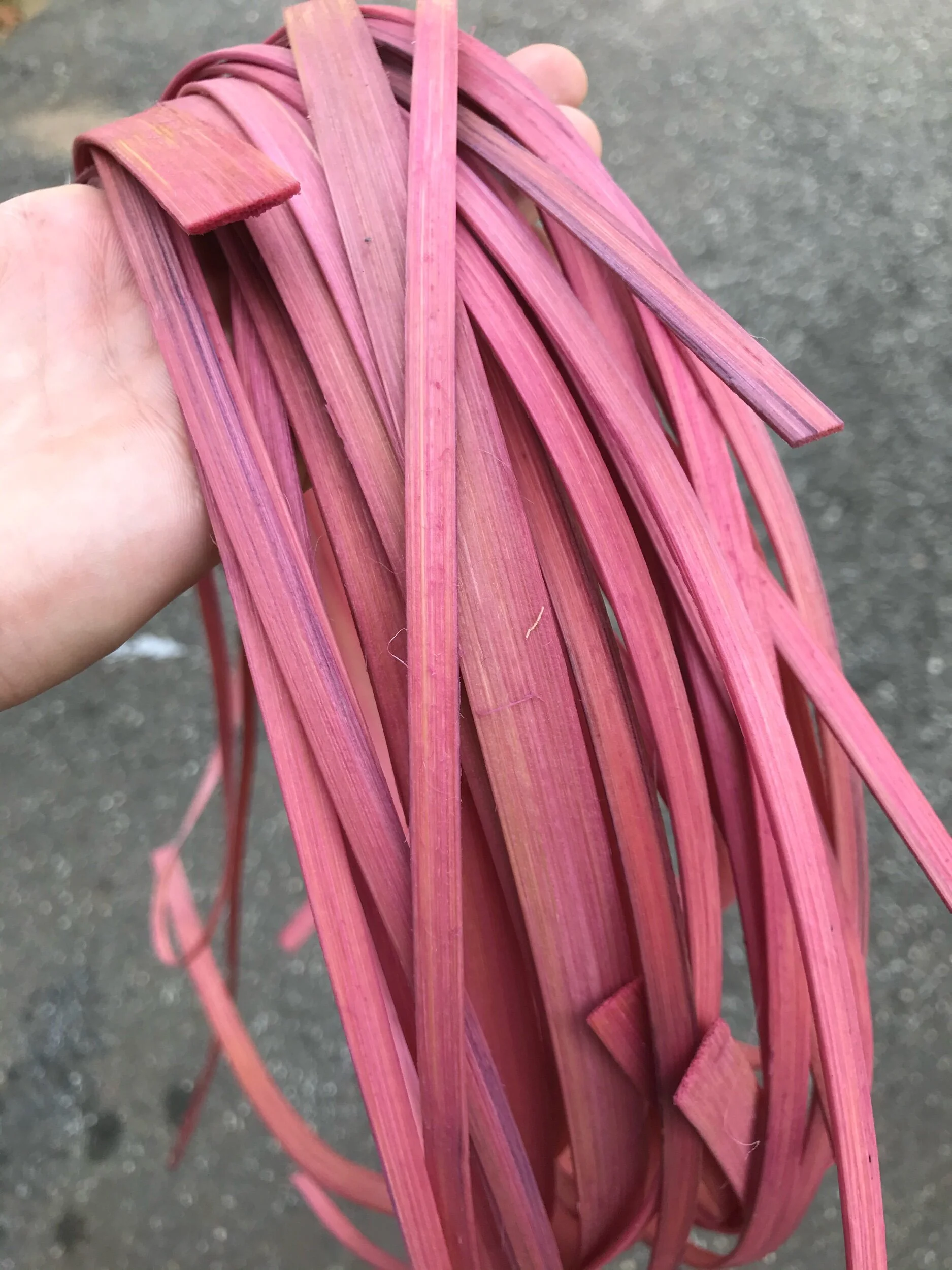This is my small batch of blueberry dyed reed when it was mostly dry. The finished color was much different than my test strip, which most likely had something to do with water dilution. Next time I use blueberries, I’ll have to make sure I use more of them!